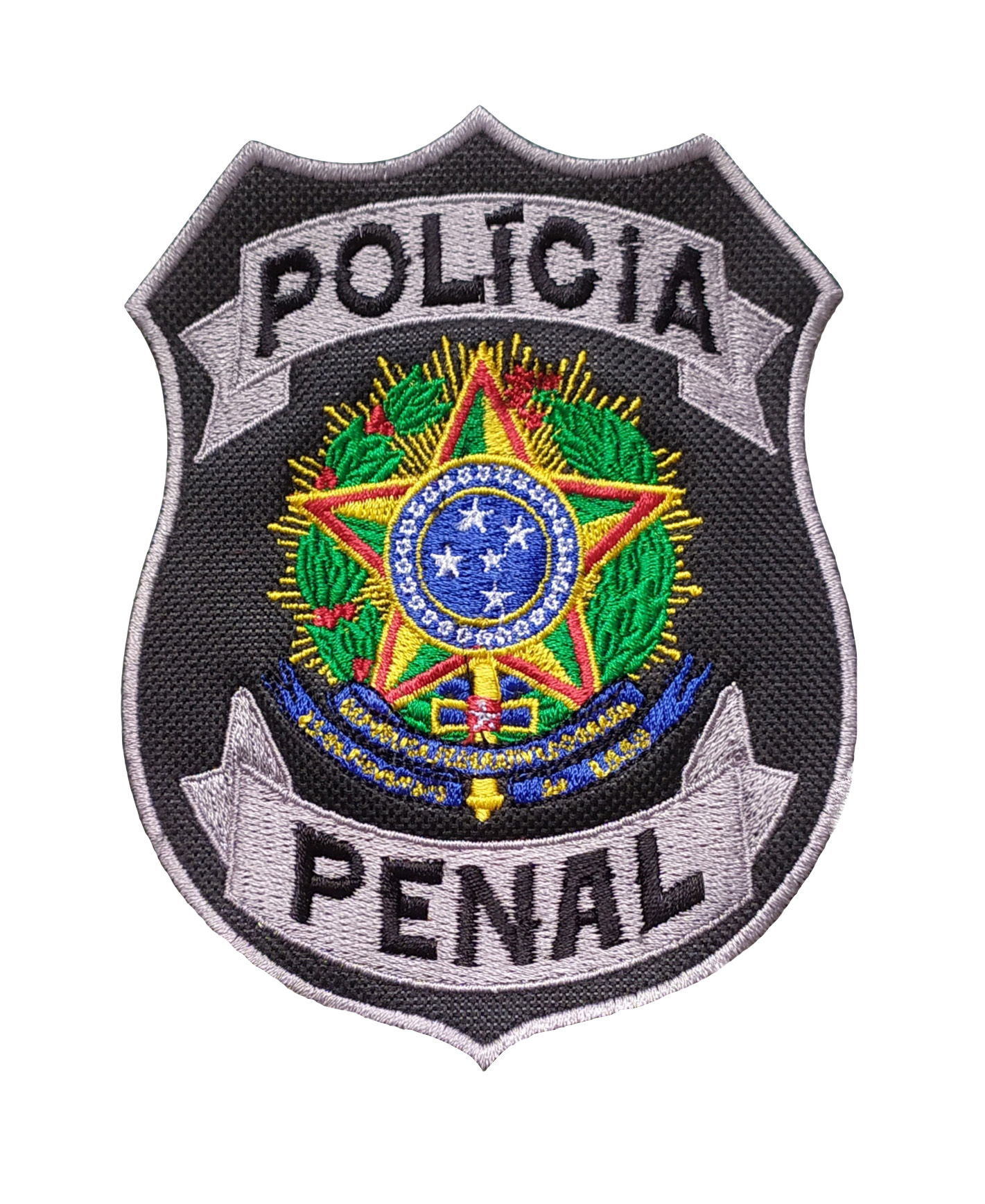 Brasão POLÍCIA PENAL bordado, medindo 11,5 cm x 8,8 cm.
