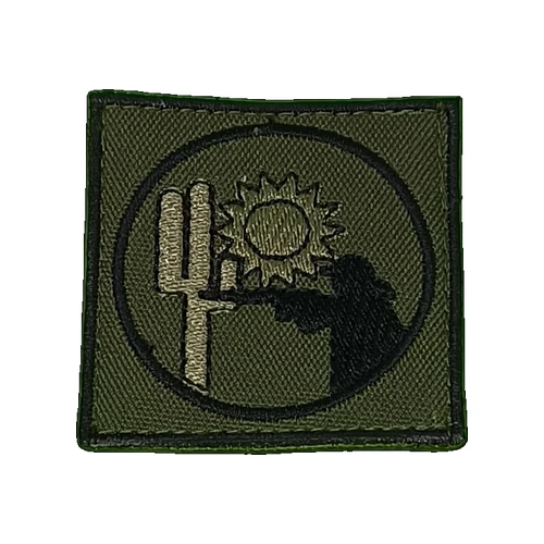 Medidas: 50 mm x 50 mm, confeccionado em fundo verde militar e com fecho de contato.