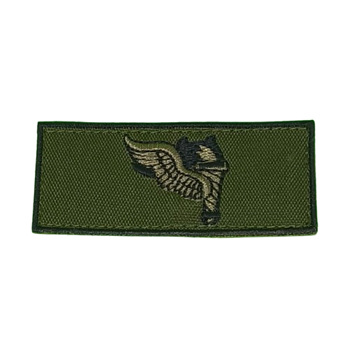 Medidas: 70 mm x 30 mm, confeccionado em fundo verde militar e com fecho de contato.