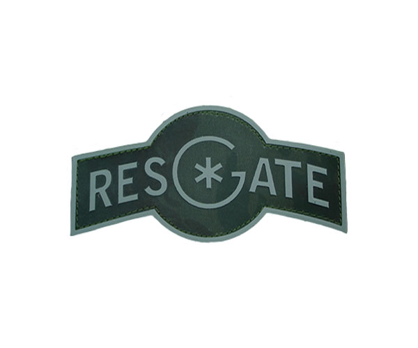 Tarjeta curva, emborrachada, RESGATE, camuflada com cinza, medindo 3 cm x 12 cm e fecho de contato verde militar costurado.