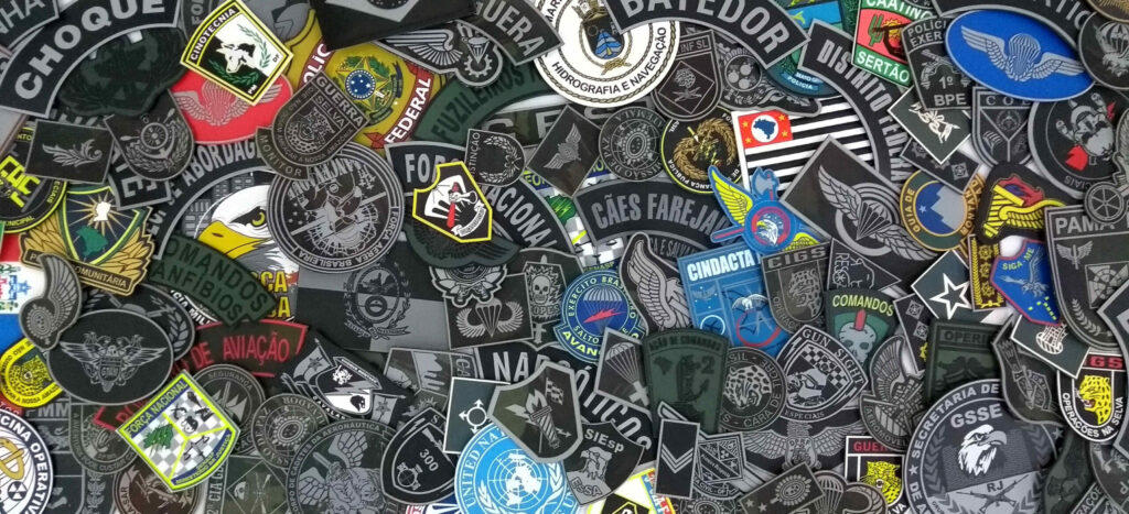 Distintivos, divisas, insígnias e chaveiros usados pelo Exército Brasileiro, Aeronáutica, Fuzileiros Navais, Polícia Civil e Militar, Guarda Municipal, Agentes de Segurança Penitenciárias, empresas de segurança, airsoft e paintball.